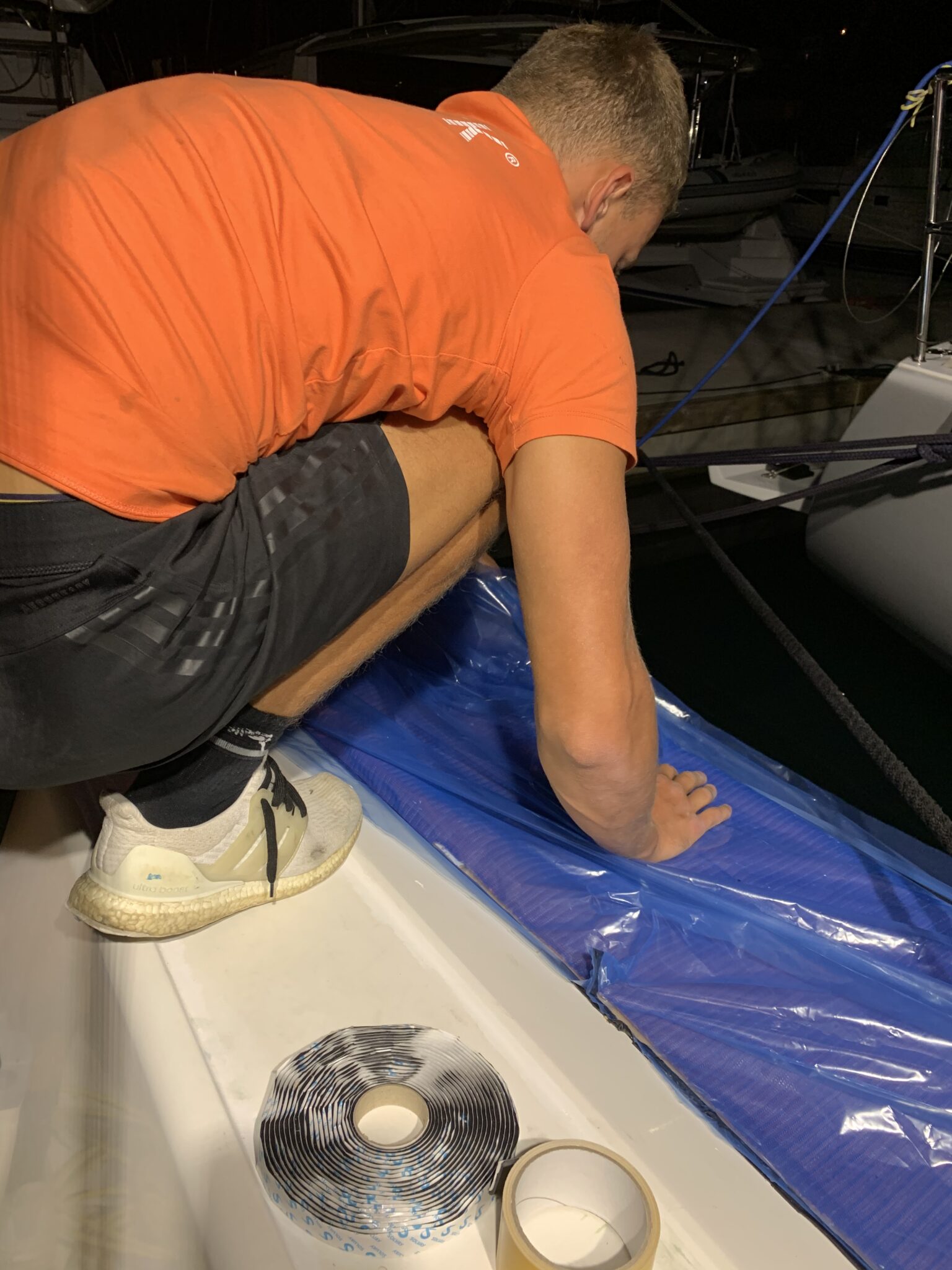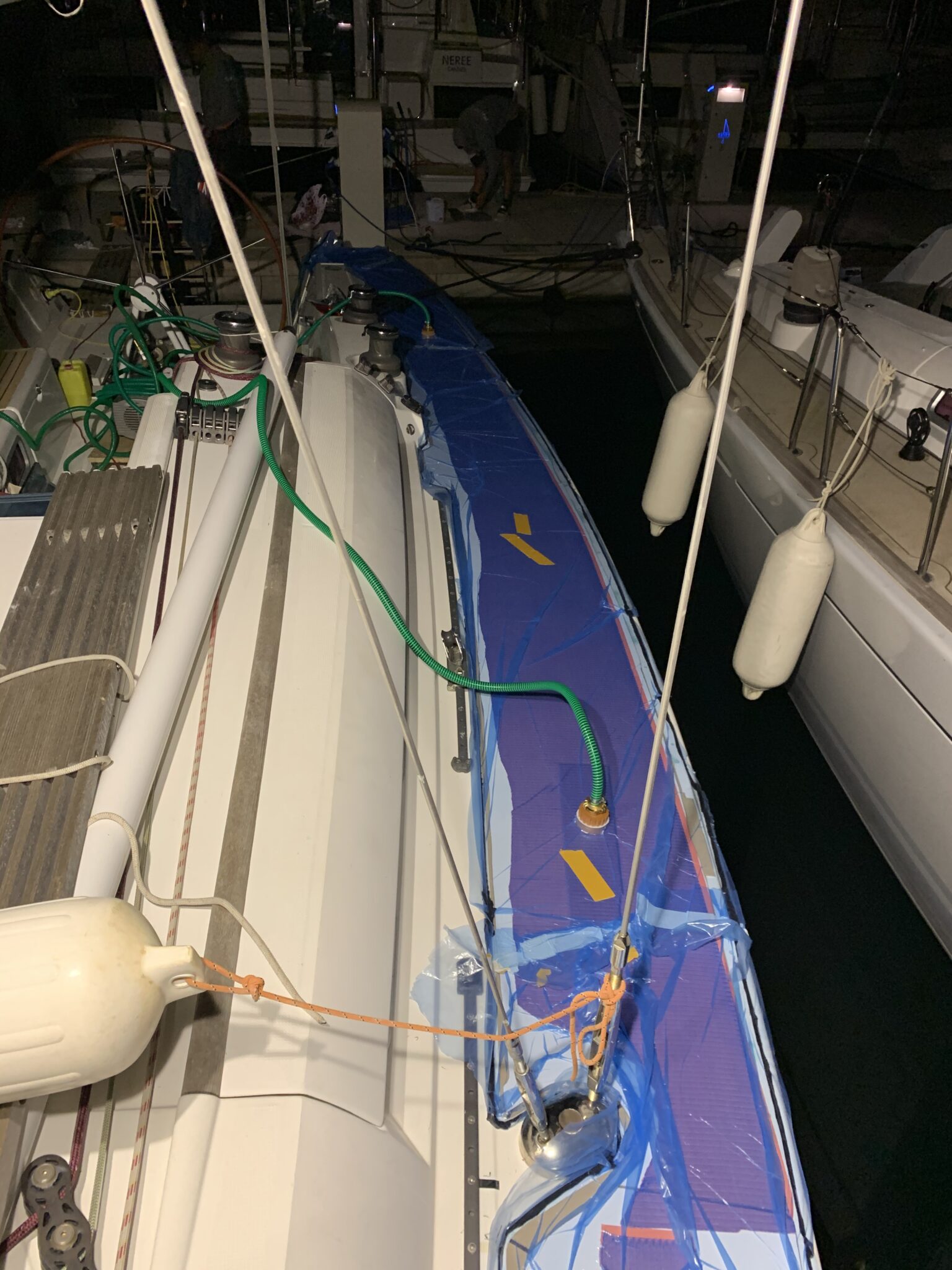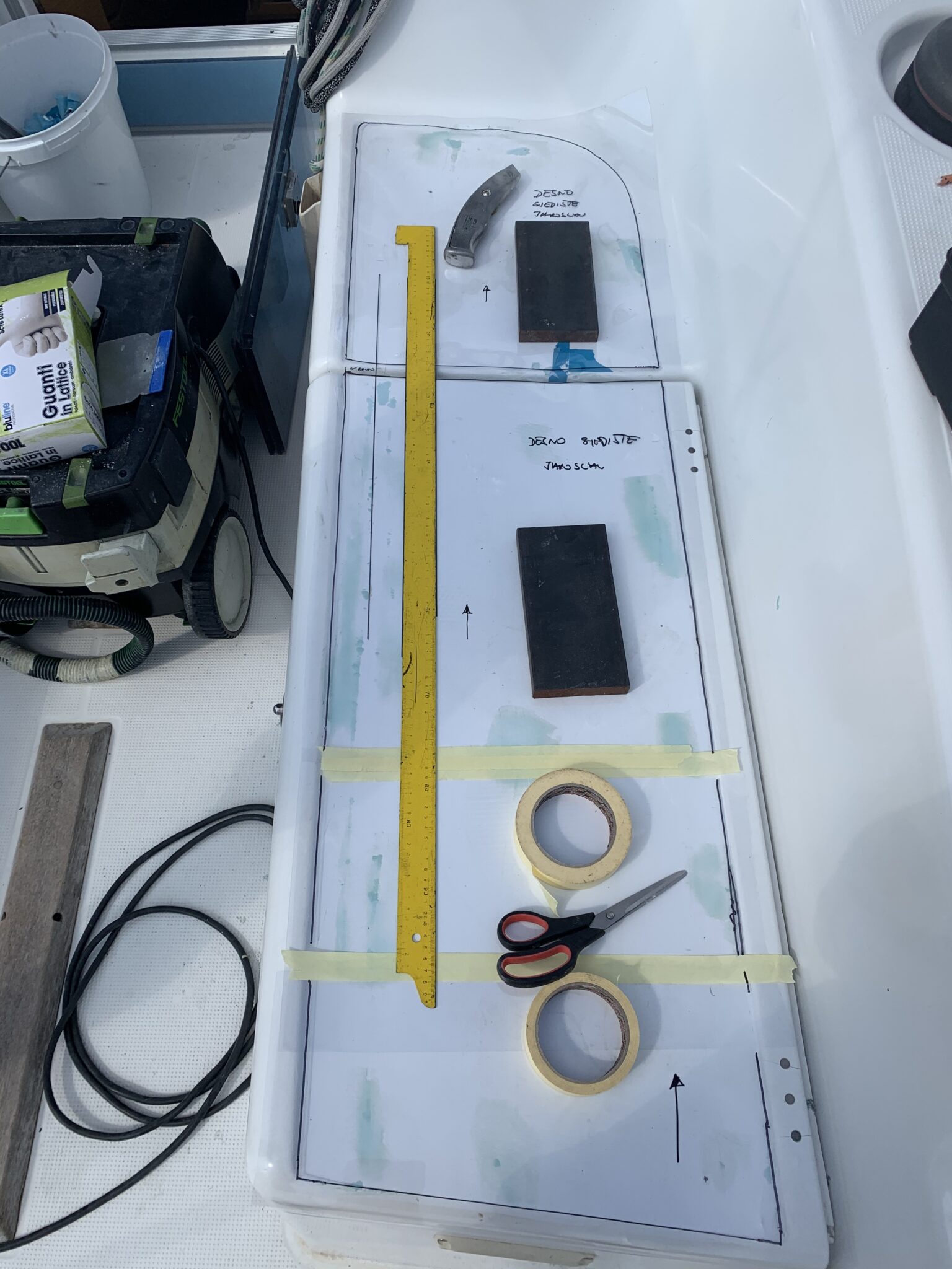 plastering, grinding and preparing the gelcoat for install PlasDECK artificial teak