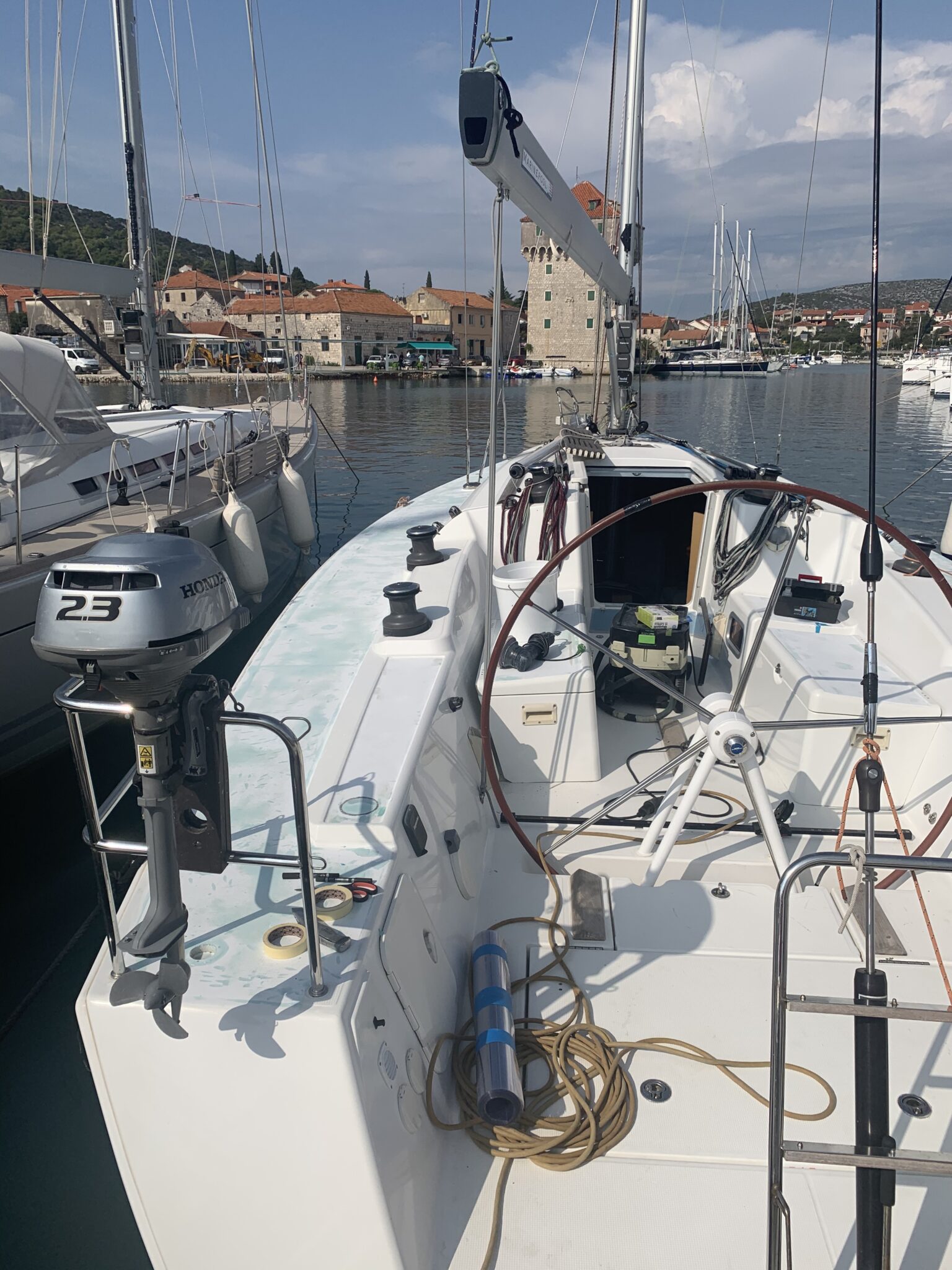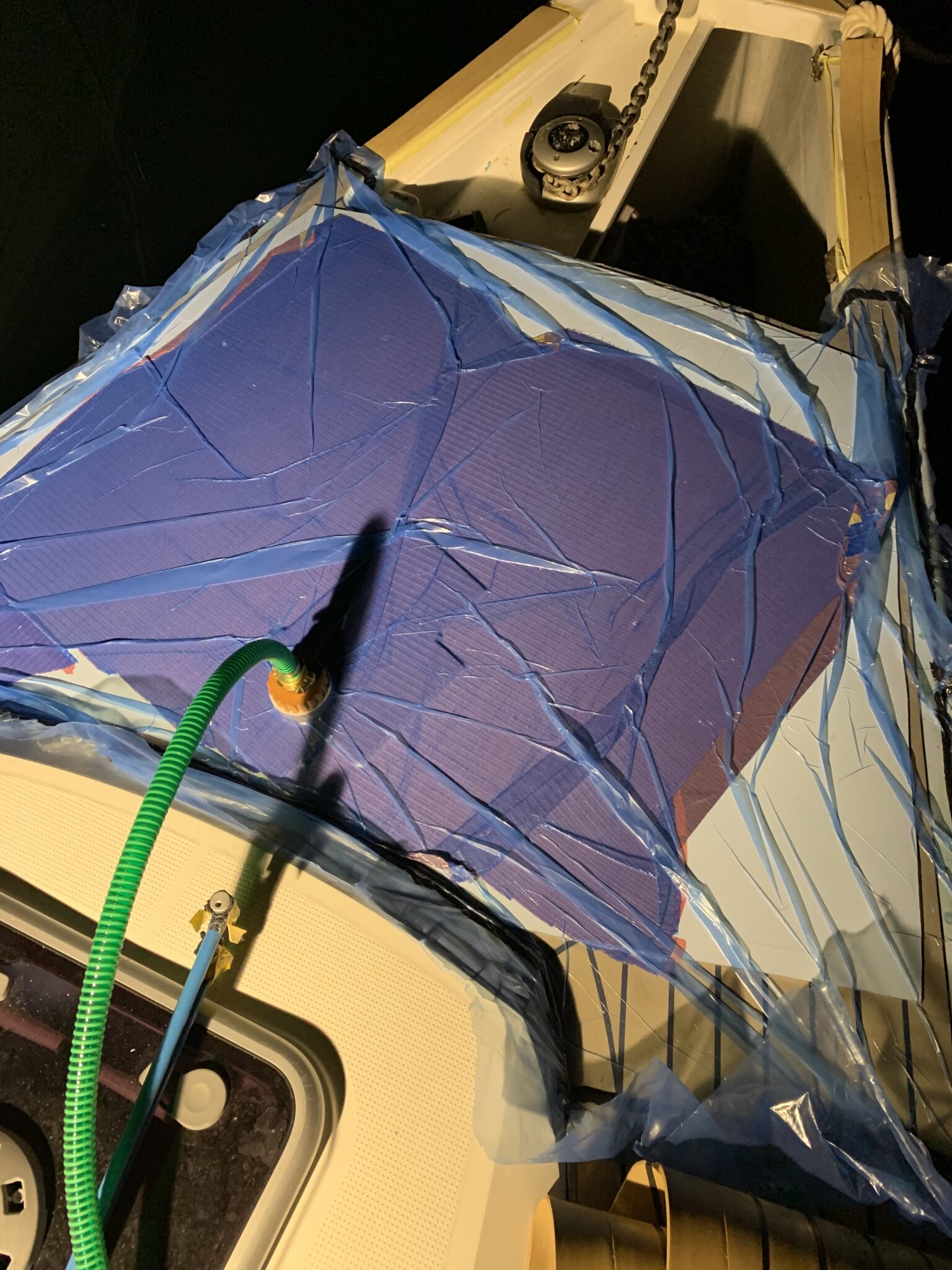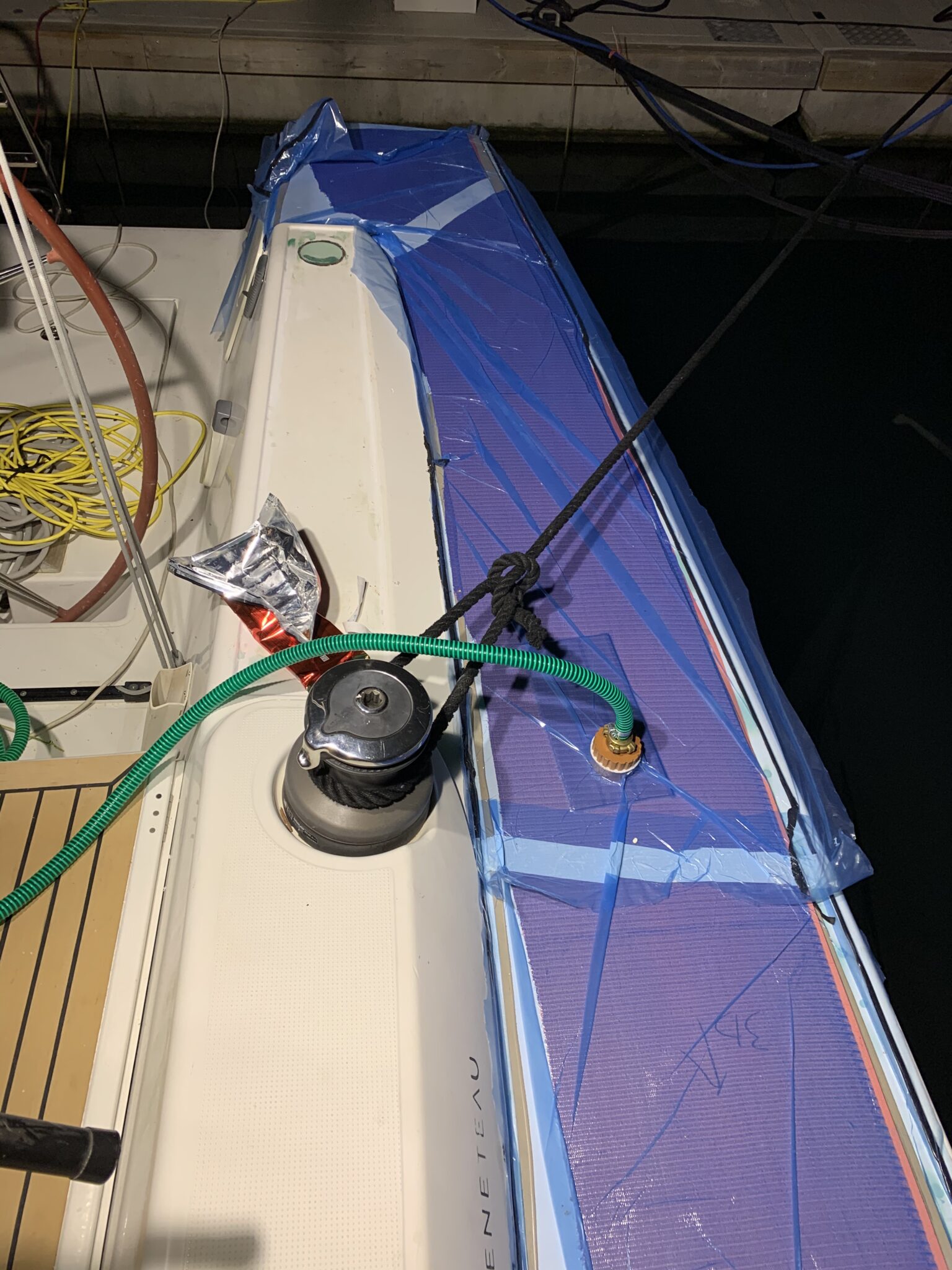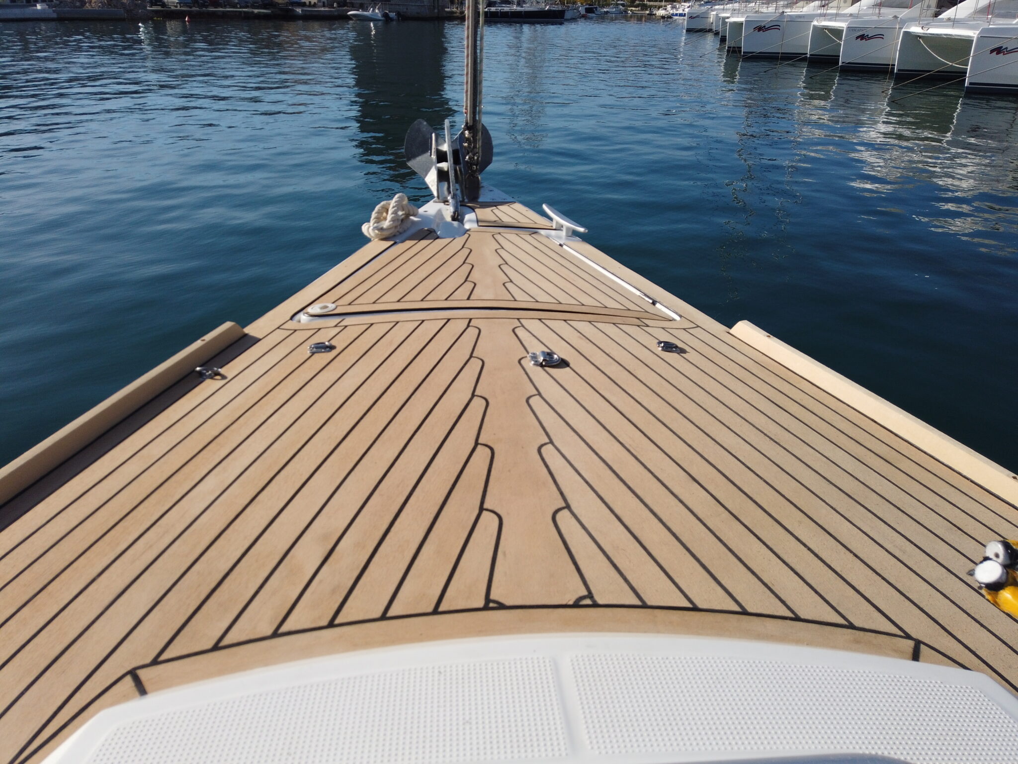 plastering, grinding and preparing the gelcoat for install PlasDECK artificial teak