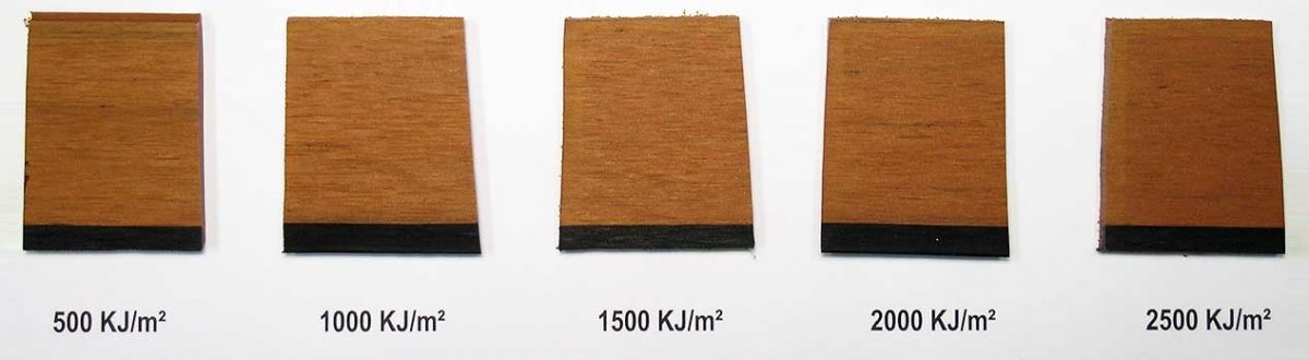 Non-migrating plasticizers – All types of plastic contain oils or “plasticizers.” These oils are usually free to move around within the plastic. They will migrate to the surface where they can be washed away, or the plasticizers will migrate to the bottom of the material and compromise the glue bond.The oils in our PVC plastic will not migrate because the oils are locked in place. That means that the PlasDECK won’t dry out, crack, or crumble over time and the PlasDECK will retain its superior adhesion. This proprietary process is unique to PlasDECK decking material and can’t be found in other synthetic decking products on the market. We have been awarded two US Patents (US Patents 7,578,251 & 7,617,791).These samples represent 500, 1000, 1500, 2000, 2500 hour exposures (i.e. 500 = 1 year, 2500 = 5 Year). The conditions of the test were 16 hours of UV light at 158ºF (70ºC), followed by 8 hours condensation at 122ºF (50ºC).Below are the actual samples that were tested. As you can see, the color remained intact and there are no signs of any degradation in the material.