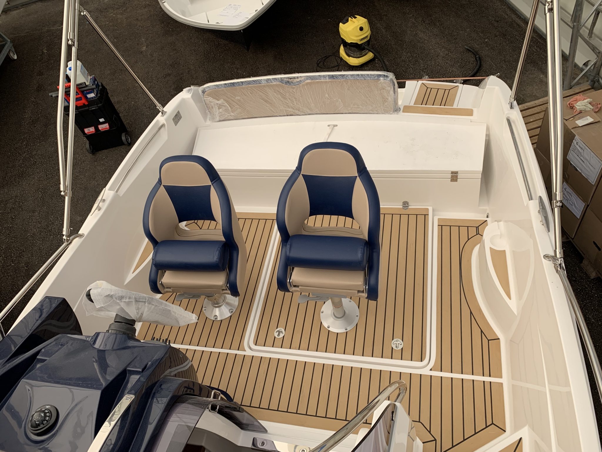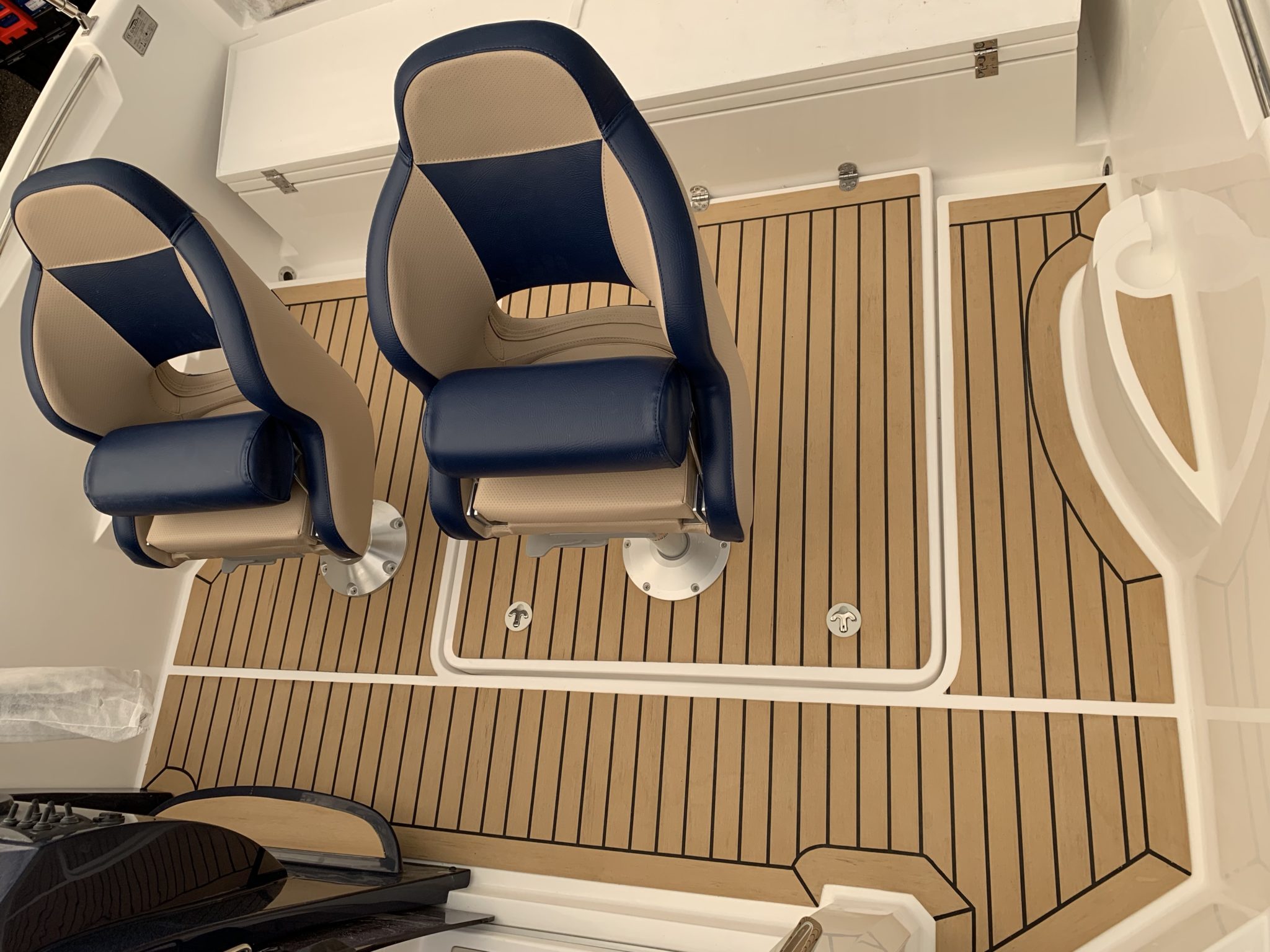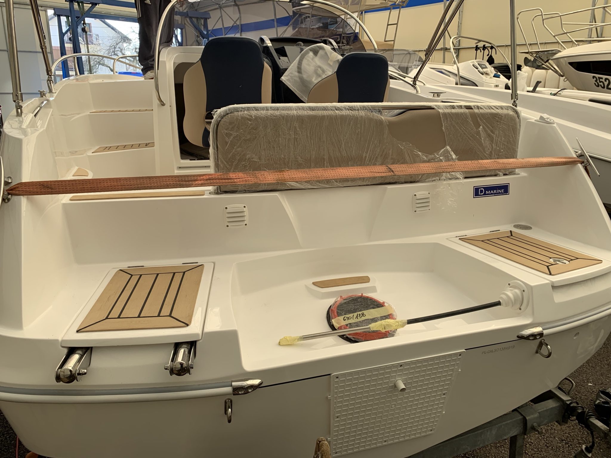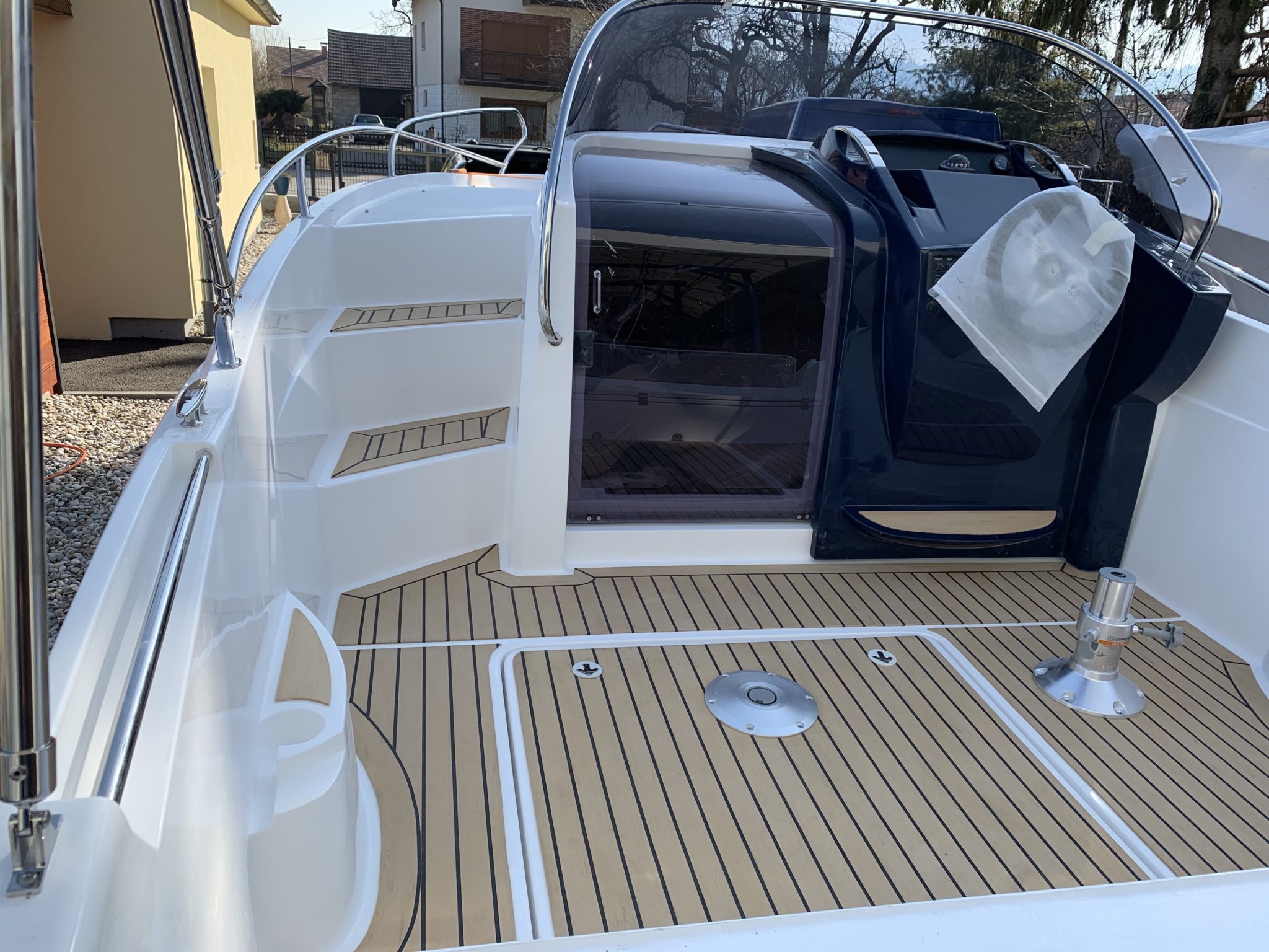 Synthetic teak PlasDECK in option with the edges on boat Galia 630 SD.